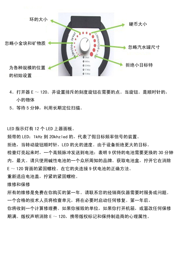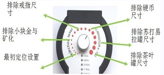 用戶(hù)通過(guò)使用“抑制電平”旋鈕調整來(lái)選擇消除器e-120 B過(guò)濾器的干擾抑制速度,以消除礦物質(zhì)-金塊、硬幣大小、蘇打罐大小或胸部大小的物體。