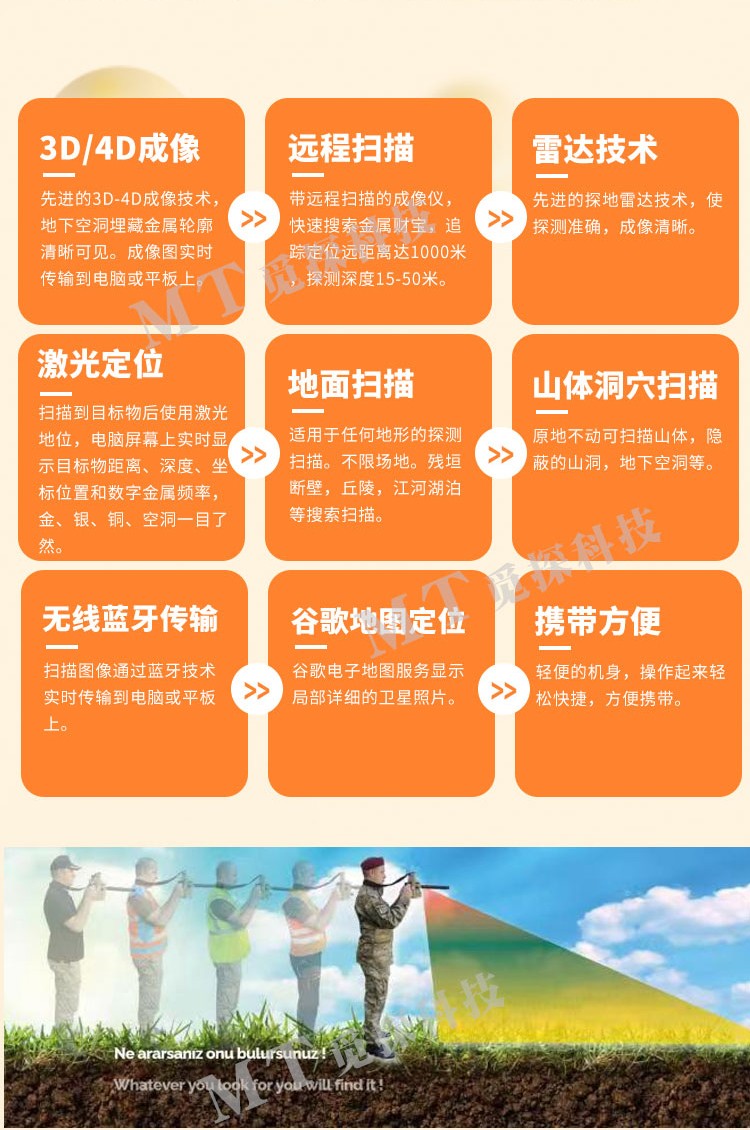 原地不動(dòng)掃描實(shí)時(shí)成像距離1000米,掃描成像深度根據探測目標物的不同深度50米,不限場(chǎng)地,殘垣斷壁,叢林樹(shù)木,丘陵山區,江,河,湖泊水下金屬寶藏搜索掃描。